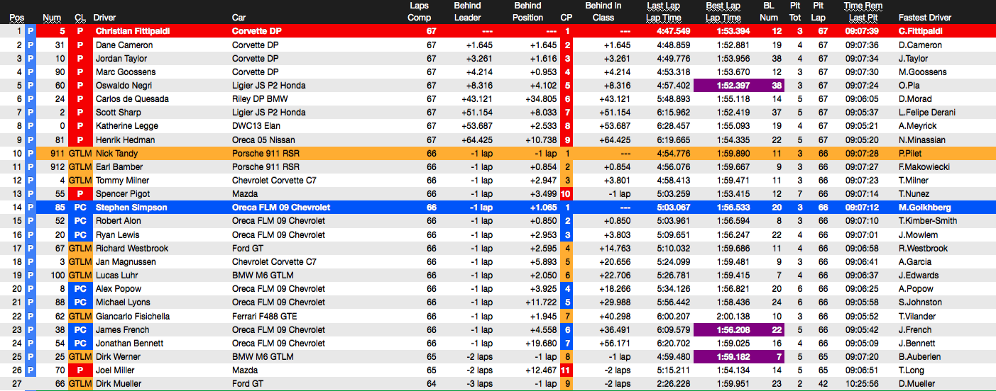 Les deux Corvette DP/Action Express Racing sont toujours aux commandes, Christian Fittipaldi devant Dane Cameron. On trouve ensuite les Corvette DP du Wayne Taylor Racing et VisitFlorida.com. La Ligier JS P2/Michael Shank Racing qui s’est élancée de la pole est 5ème, deux places devant celle de Tequila Patron ESM.