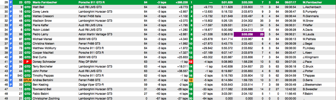 JDC-Miller Motorsports reste en tête de la catégorie Prototype Challenge. Une fois de plus, les Porsche 911 RSR équipées de pneumatiques Michelin ont fait des merveilles sous la pluie. Nick Tandy précède Earl Bamber au classement. On trouve également une Porsche aux commandes du GTD avec Mario Farnbacher sur la #23 du Team Seattle Alex Job Racing. A noter les soucis en piste de la Ferrari 488 GTE/Scuderia Corsa de Bertolini et la sortie sous la pile de pneus de la Ford GT #66 de Dirk Müller.