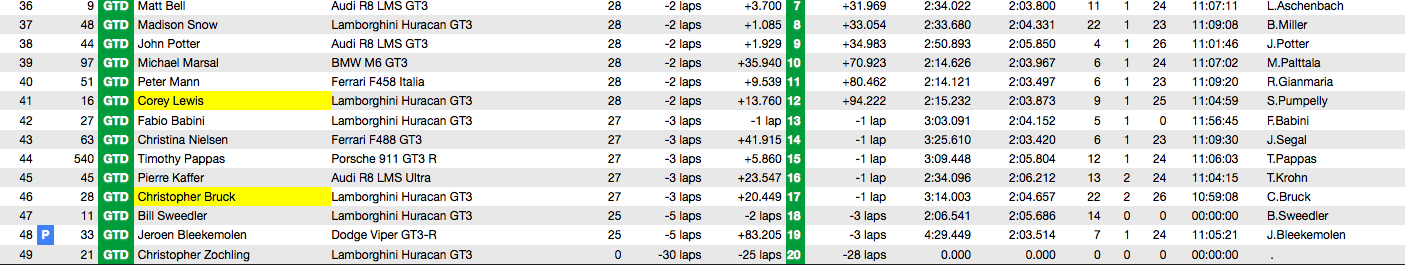 Deux Porsche 911 GT3-R dominent en GTD avec la tête pour Patrick Lindsey (Park Place Motorsports) devant Mario Farnbacher (Team Seattle Alex Job). Troisième place pour l’Audi R8 LMS/Magnus Racing de John Potter. A noter des soucis de transmission pour la Dodge Viper GT3-R/Riley Motorsports de Jeroen Bleekemolen.