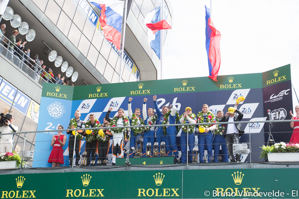 #26. Auteur de sa troisième pole consécutive en FIA WEC, G-Drive Racing a conservé les commandes durant la première heure. Légèrement décalée en stratégie, puis victime d’une crevaison lente (3e heure) et sanctionnée d’un drive-thru (6e heure), la ORECA 05 n°26 est rapidement revenue jouer les premiers rôles. Le rapide trio Rast/Rusinov/Stevens a constamment occupé le Top 3, s’emparant à plusieurs reprises de la tête de la catégorie. C’est finalement au petit matin que la n°26 a concédé du terrain sur le futur vainqueur, à travers notamment une pénalité d’une minute. En dépit d’un dernier tiers de course parfait, l’écurie russe termine sur la deuxième marche.