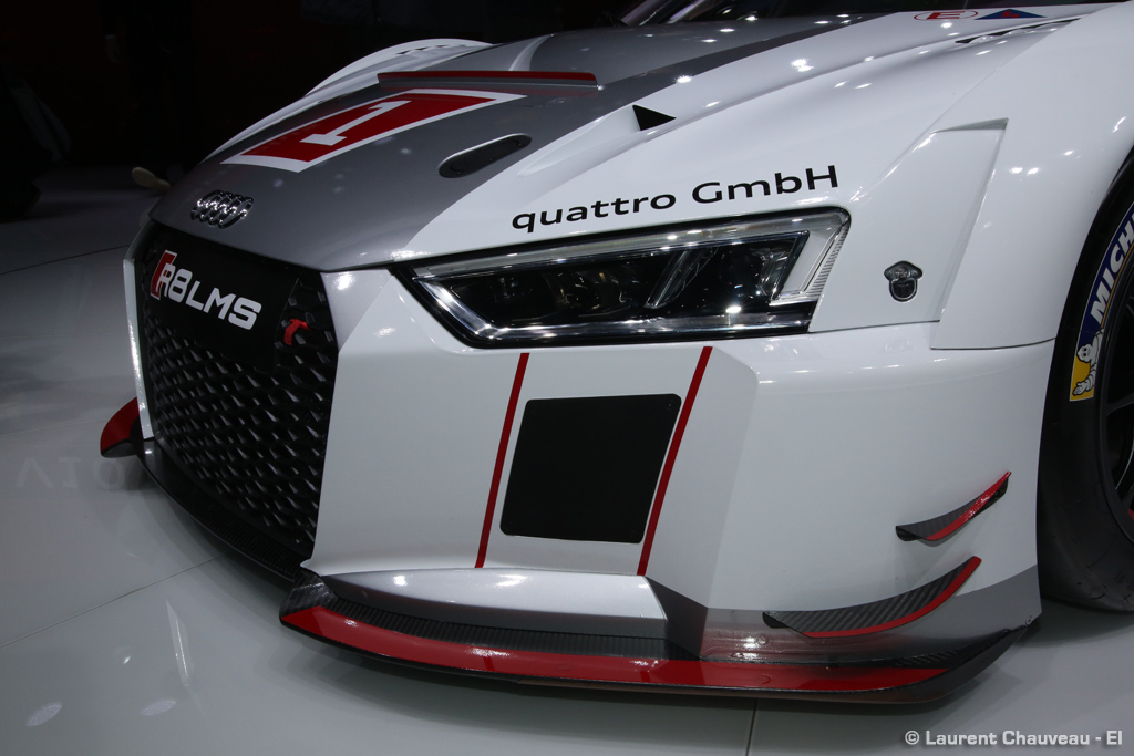 La durée de vie du moteur V10 5,2 litres de 585 chevaux est de 20 000km, celui-ci étant conçu sur la même chaîne de production que le moteur de série. La boîte de vitesses séquentielle à 6 rapports se veut plus rapide. Interdit sur la dernière version de la R8 LMS ultra, le diffuseur arrière est ce coup-ci bien en place. Les passages de roues sont ouverts vers l’arrière pour une meilleure circulation d’air. Le refroidissement du radiateur avant est 10% plus efficace afin de gérer au mieux les températures extérieures maximales. Quant à la circulation d’air dans le cockpit, elle a elle aussi été bien pensée avec un débit de 250 litres d’air à 200 km/h. A noter que l’auto exposée à Genève est équipée de gommes Michelin et non Pirelli comme dans la majorité des championnats GT3.