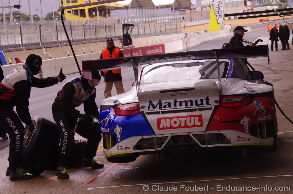 Avant même le départ, deux des principaux candidates à la victoire, la Porsche 911 GT3 R IMSA n°76 et l’Audi n42 du Saintéloc Racing, toutes deux sur le podium hier, obéraient leurs chances de succès. Durant les tours de formation, bien que le ciel soit menaçant, les deux voitures repassaient par leur stand pour chausser des slicks, pariant sur une amélioration de la météo. Pari perdu, puisque la pluie se mit à tomber peu après et s’intensifier dès les premiers tours. Qui plus est, Grégory Guilvert (Audi n°42) se faisait piéger par la fermeture de la voie des stands et devait attendre le premier passage du peloton pour s’élancer…