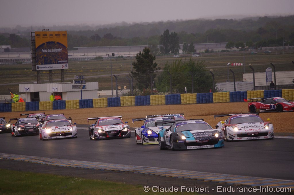 Au départ, Soheil Ayari (Ferrari Duqueine Engineering n°9) qui avait donc hérité de la pole, ne s’en laissait pas conter et emmenait la meute, tandis que Nicolas Armindo, en slicks avec la Porsche IMSA n°76, ne pouvait résister et allait devoir repasser par les stands pour changer ses gommes. Dans la montée vers le Dunlop, Morgan Moulin-Traffort –Ferrari SOFREV-ASP n°1) partait sur l’extérieur et traversait le bac à gravier.
