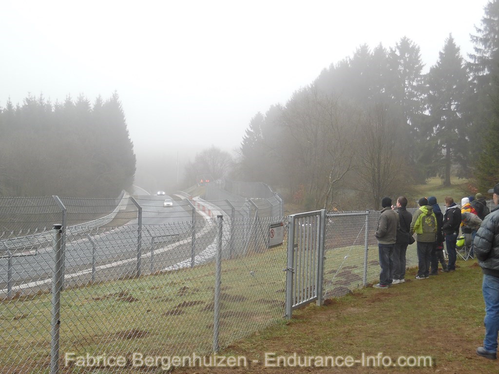 Alors que la veille le Nürburgring était bercé par un soleil radieux, les concurrents présents à la traditionnelle journée test d’avant-saison ont du faire face à des conditions climatiques pour le moins pourries. Un ciel désespérément gris, un mercure ne dépassant pas les…2° et un léger crachin rendant la piste extrêmement glissante étant au menu du jour!