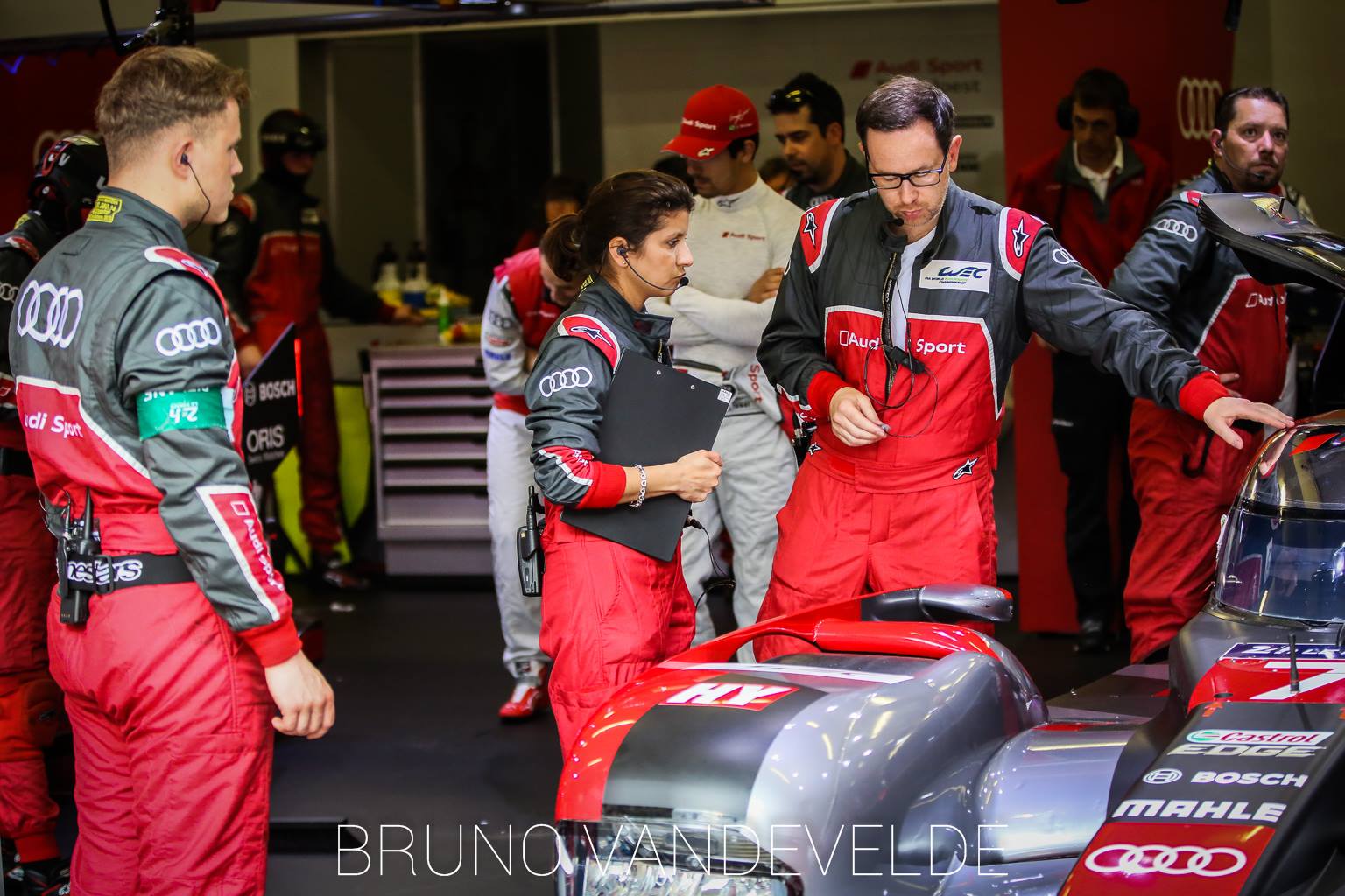 Chez Audi Sport Team Joest, Leena Gade dirigeait une équipe de 11 personnes avec des fonctions très précises : responsable de la construction de la voiture pour les essais et les courses y compris la surveillance du kilométrage des pièces, gestion des différents domaines techniques, coordination de cinq ingénieurs chargés d’analyser les données et des systèmes de fonctionnement (moteur, boîte de vitesses, hybride), responsable de la stratégie de course, choix des pneus, ravitaillement, utilisation de la voiture de sécurité et des drapeaux jaunes avec l’aide de logiciels stratégiques, contrôle global des ravitaillements, travail sur l’auto, stratégie pour les pneus et le carburant, choix du pilote pour le début de course, la qualification, le temps en piste, coordination des essais.