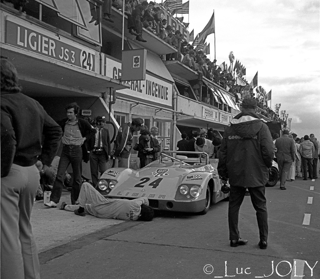 En 1969, Guy Ligier présente au Salon de Paris sa JS1. Luc la photographie dès les essais d’Avril 1970 au Mans ou elle fait sensation autant que « la 911 de Raymond aux ailes de 4CV » ! Pour les plus jeunes de nos lecteurs, rappelons que ce que nous appelons aujourd’hui la Journée Test des 24 Heures se tenait à l’époque en Avril, voire en Mars ! Cela laissait bien plus de temps qu’aujourd’hui aux équipes pour faire évoluer leurs voitures si le besoin s’en était fait sentir…