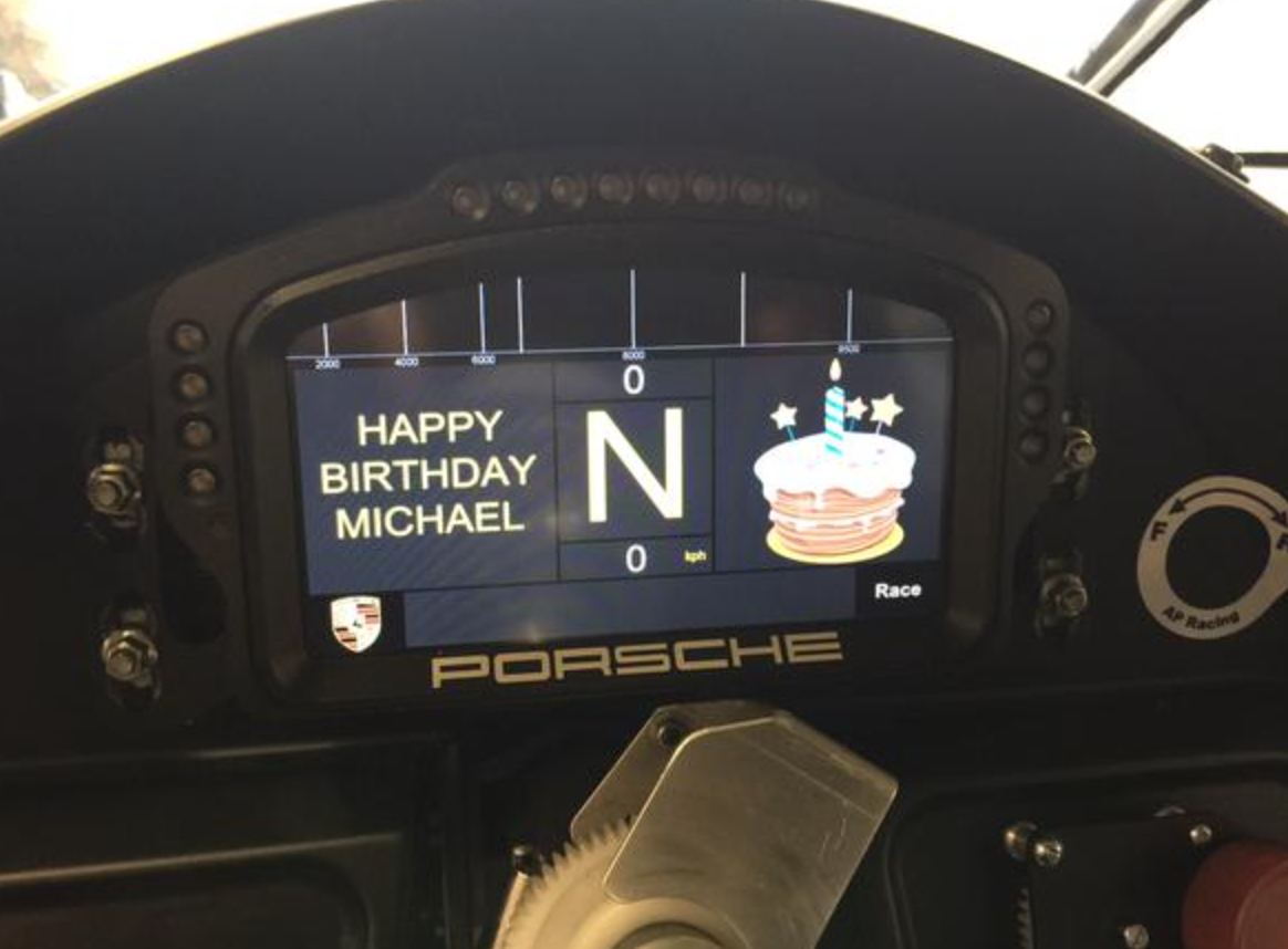 - Après Mark Webber et le Dr Ullrich, c’est au tour de Michael Christensen de fêter son anniversaire. Le pilote officiel Porsche qui roule sur la 911 RSR #91 a eu la bonne surprise d’avoir un message sur son tableau de bord.