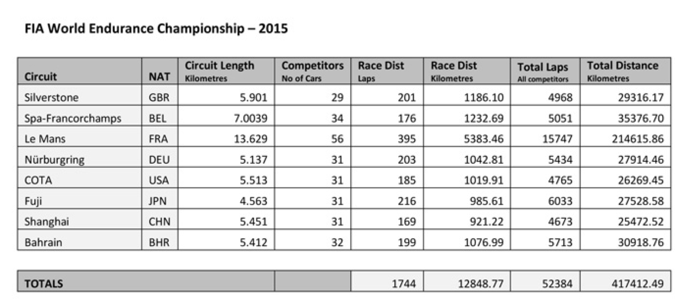 Avec ses huit épreuves en 2015, le Championnat du Monde d’Endurance de la FIA a roulé sur trois continents. Les concurrents ont couvert 52 000 tours, ce qui équivaut à 417 400 km sur les 66 heures de course. La distance parcourue est supérieure à dix fois le tour de la Terre. Bien entendu, les 24 Heures du Mans ont pris une grande partie de ces chiffres avec 214 615,86 km pour les 56 concurrents de la course. La Porsche 919 Hybrid victorieuse a bouclé 5383,46 km.