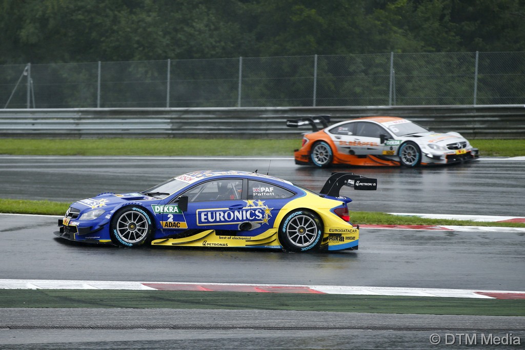 La pluie redoublait de force. Mortara attaquait et se rapprochait de Rockenfeller, toujours troisième. Gary Paffett s’arrêtait au stand au 18ème tour, imité un tour plus tard par Ekström et Mortara.