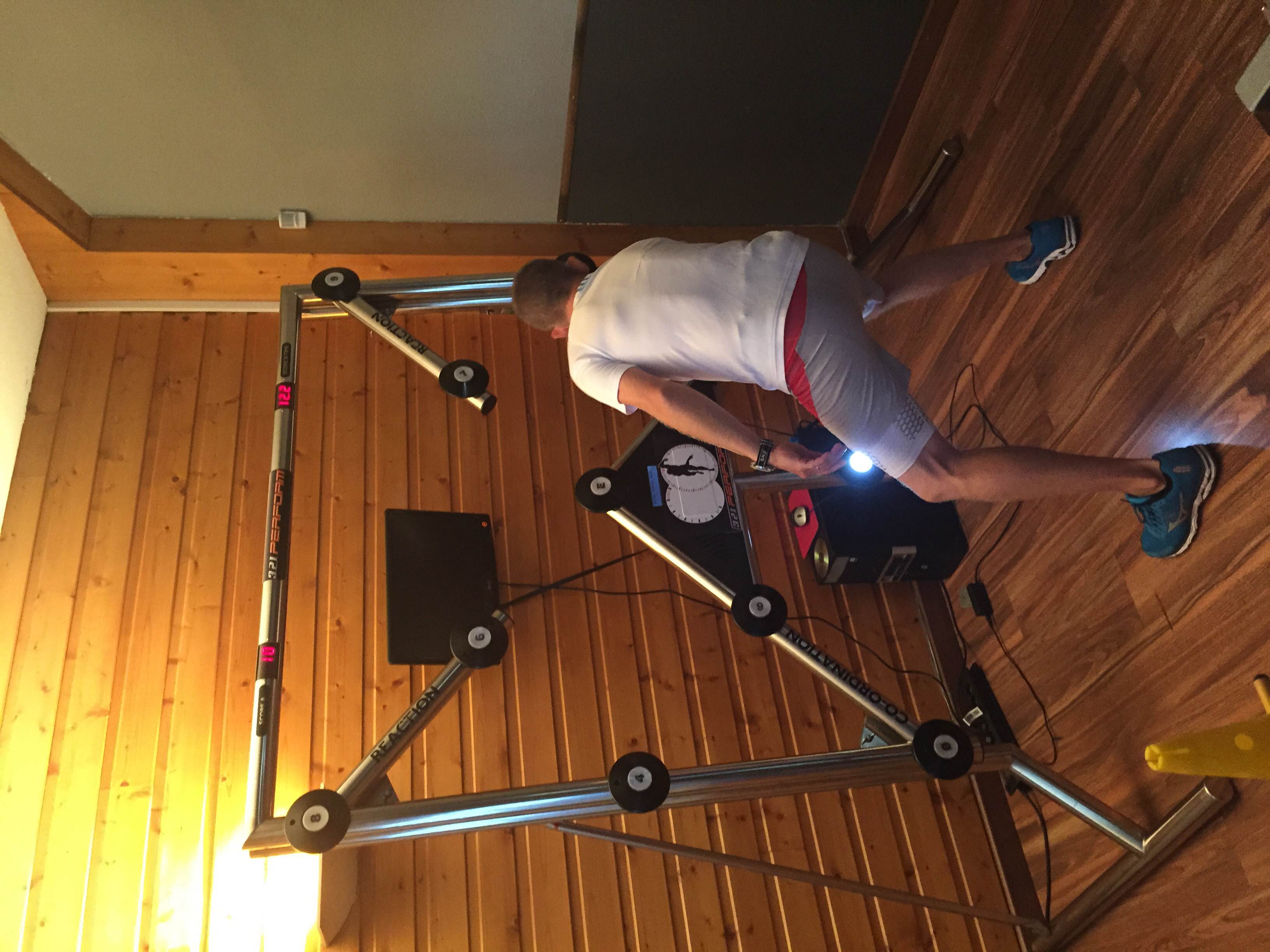 J’arrive dans un univers qui m’est totalement inconnu et je dois me mesurer à deux pilotes chevronnés habitués au Batak. Le but est clair : appuyer sur un maximum de boutons éclairés en une minute. Sauf que pour rajouter un peu de piment, il faut appuyer sur le bouton opposé à celui qui éclaire. Quand je tourne à 90, un Matthieu Vaxivière est à plus de 130. En même temps, lui veut aller en F1, moi pas. François nous fait lui aussi un festival. La suite se corse car il faut enchaîner plusieurs exercices le plus vite possible qui font appel à la mémoire et à la concentration. L’un d’entre eux ne me plait guère. Xavier lance une balle de tennis jaune ou orange. Au sol, vous avez deux marques, une jaune, une orange. Lorsque Xavier vous lance la balle, il vous donne un chiffre. Si le chiffre est pair, il faut appuyer sur la marque de la couleur de la balle avec le pied droit. Forcément si le chiffre est impair, c’est l’inverse. Capito ? Mouais sur le papier seulement. C’est simple à comprendre mais on oublie vite le bon pied. Bref, les exercices s’enchaînent et aucun de nous trois ne se relâche. Comme dans toute course, l’objectif est bien de battre son petit camarade. Un compétiteur reste un compétiteur. Tout est ensuite étudié et disséqué pour voir où il est possible de s’améliorer. D’autres exercices nous attendent durant cette première matinée, la plupart devant un ordinateur. La méthode étant déposée, on ne va pas en donner tous les détails mais sachez que même devant un ordinateur, tout a un lien direct ou indirect avec le sport auto : travail du champ visuel, adresse, réactivité, réflexe. Tour à tour, chacun de nous trois se prête au jeu.